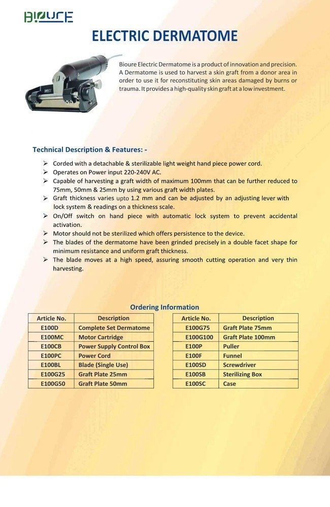 Bioure Battery Operated Dermatome instrument is a revolutionary innovative product. A Dermatome instrument is used to harvest a skin graft from a donor area in order to use it for reconstituting skin areas damaged by burns or trauma.