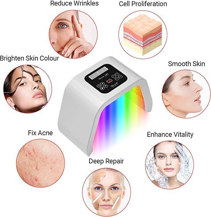 Blue light: Reduces skin breakouts, suppresses sebaceous glands, and sterilises acne bacteria.