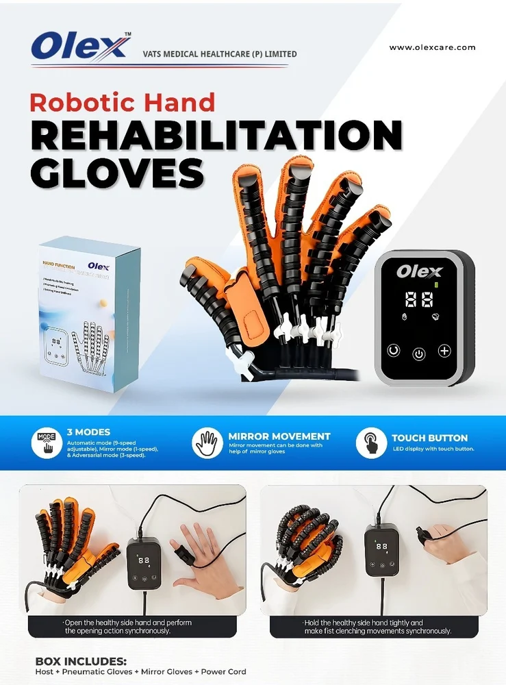 The Olex Robotic Hand Rehabilitation Gloves are advanced therapeutic devices engineered to provide robot-assisted hand rehabilitation for people with limited hand mobility due to conditions such as stroke, paralysis, neurological disorders, post-surgical recovery, or musculoskeletal injuries. These gloves use robotics and mechanical assistance to support, guide, and encourage the user’s hand movements, enabling structured rehabilitation in both clinical and home settings.